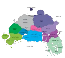 The continent of Kalimdor was introduced in Warcraft III: Reign of Chaos and is made up of 18 zones. Whereas the Eastern Kingdoms can be described as the equivalent of medieval Europe, with traditional kingdoms and advanced cities, Kalimdor can be compared to the Americas at the time of the first arrivals of Europeans, full of wild lands. The geography and topography of Kalimdor are similar to North America and Africa, with massive, ancient forests and mountains covering the North and vast deserts and savannahs in the South. The Night Elven kingdom is located in the northwest region of Kalimdor, also including the island Teldrassil (actually a giant tree, similar in lore and spelling to Yggdrasil) off the northwest coast, which contains the city of Darnassus.