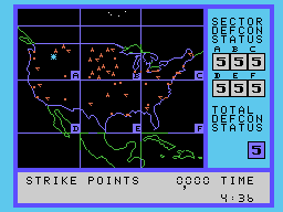 The continental United States is divided into six sectors, each with its own bases and major cities. ICBMs and bombers rain over the North Pole, while submarines inch toward coasts. Defenses consist of ABMs, interceptor aircraft, submarines and an experimental particle beam satellite that trumps everything else but weaves in and out of sectors on a fixed orbit. US units are individually far superior, but vulnerable to the destruction of interceptor and missile bases. Events proceed in real time in all sectors as defenses gradually crumble.