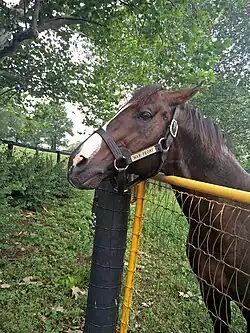 War Front is a bay horse bred by Joseph Allen and was foaled on February 11, 2002 at Claiborne Farm in Paris, Kentucky.[1][2] He was sired by Danzig, who won three minor races, but was then retired to stud undefeated as a result of knee problems. He went on to become a successful stallion and was champion sire of North America in 1991, 1992 and 1993. Amongst his other progeny are Chief's Crown, Dance Smartly, Danehill, Dayjur, Green Desert, Hard Spun and Lure.[3] War Front's dam is Starry Dreamer, a daughter of Rubiano who won six races and was placed in a number of graded races.[4] War Front was trained by H. Allen Jerkens.[5] At maturity he reached 15.3 hands (63 inches, 160 cm) high.[6]