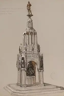 At around 90 feet (27 m) high,[3] the war memorial monument is the most prominent construction in the park. It was designed by local architect T. F. Tickner and £5,000 was raised from a public appeal that commenced in 1924 to fund the building work.[11] It was built in 1927 and dedicated by Field Marshal Douglas Haig on 8 October 1927.[2][4] It is made of Portland stone, and was built by John Gray who also built the Courtaulds works at Foleshill and a number of housing estates. Inside the memorial is a room called the Chamber of Silence which contains the "Roll of the Fallen", a list of all Coventry men killed in the two World Wars and the Gulf War, and is open to the public every year on Remembrance Sunday.[3]