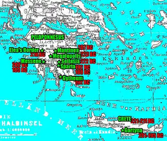 - ^ The correct title for Nabis's office is ambiguous. He himself claimed descent from the Eurypontid Spartan king Demaratus and is presented with the title basileus on coins.[4] On the other hand historians such as Livy and Polybius referred to him with the title of tyrant because he had overthrown the old government of Sparta. The home countries of both authors, Rome and the Achean League, were involved in this conflict and considered a possible restoration of one of the toppled governments during this war.