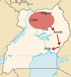 - ^ Minister Lawrence Semogerere was unable to identify whether Ochuli's group was loyal to a larger HSM splinter. It was a few hundred strong, and possessed only few guns. One member of the faction, "Brigadier Kasabong" appeared to be of western Ugandan origin. Ugandan intelligence and local civilians indicated that Ochuli's group might have been part of Lukoya's movement.[78]