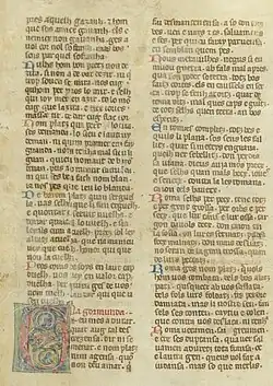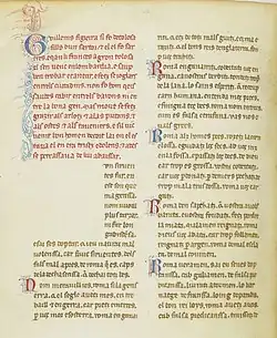 The principal sources on the war are in Latin. The Chronica of Richard of San Germano, which has a pro-imperial stance, is one of the most important narrative sources.[1][2][3] The biography of Gregory IX in the Liber censuum provides a valuable pro-papal narrative.[4] Other important chronicles are Roger of Wendover's Chronica sive flores historiarum[3][5] and the Chronicon of Aubry of Troisfontaines.[3] From a crusader perspective the war is covered in the Colbert–Fontainebleau Eracles and the Chronicle of Ernoul and Bernard the Treasurer.[3]