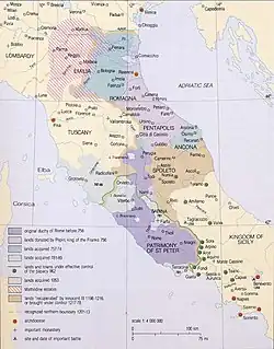 A papal army under John of Brienne and Giovanni Colonna expelled the imperial army from Ancona and Spoleto between late 1228 and the spring of 1229.[71] In early 1229, Rainald bought the support of four towns in the march of Ancona by issuing privileges to Osimo, San Ginesio, Ripatransone and Recanati.[72] He was ultimately forced back on Sulmona, where he was besieged.[73]