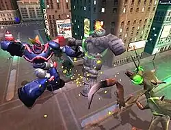 Also unlike most fighting games, players are allowed to roam freely within the city area, which allows climbing of jumping from buildings and cliffs. Monsters can use the environment to deal out damage to their foes by making weapons of various objects found within the city, such as vehicles and rubble as projectiles, steel girders and stone columns as clubs and radio antennae as a spear to impale others, temporarily stunning them.[4] There are also some environment pick-ups, which can increase health or stamina, appearing as green or blue orbs and floating radioactive signs.[5] Buildings can be destroyed if a monster directly attacks or is thrown into it. In some cities, taller buildings can topple over sideways that can crush other monsters, killing them instantly. In the Adventure mode, along with a series of set fights with other monsters, boss battles are also present. They are much larger than the standard playable monsters and required certain strategies to defeat. "Tokens" can also be earned through Adventure mode, which can be spent at the "Unlocks" shop to unlock more cities, monsters, and monster skins. And you also can unlock mini-games like dodge ball or city destruction.[6]