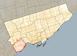 The ward occupies the southwestern part of Toronto. It is roughly bordered on the west by the Etobicoke Creek, and on the east by the Humber River. On the north, Ward 3 is roughly bordered by Bloor Street, Kipling Avenue, the Mimico Creek and Dundas Street, and on the south by Lake Ontario.[3]