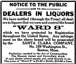 In 1898 Democratic political czar Martin M. Lomasney hoped to capture a seat in the state's legislature, the General Court of Massachusetts. Lomasney held considerable power in the city for nearly 50 years. The story goes that the drink was created to honor his election, and the city's Ward 8 which historically delivered him a winning margin.[2] In 1915 the Santa Clara Company registered "Ward 8" as a trademark with the United States Patent Office claiming use since November 1912 [3] and published a notice that they would prosecute any infringement.[4] During prohibition the Daily Boston Globe reported that the drink was believed to have originated at the "old" and abandoned Quincy House.[5] Competing but unfounded myths abound in print and on the Internet. One story reports that it originated in New York in an area known for political corruption, and another that the cocktail is a traditional drink of the Scots Guards.