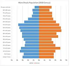 The median age of Ware Shoals' residents was 42.2 years old in 2010; 39.7 years for men and 44.6 for women. Ware Shoals, like much of the United States, has a constrictive population pyramid, the result of declining birth rates and increasing life expectancy.