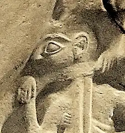 Depictions of warfare are a common theme in Mesopotamian art. Usually the art, commissioned by the victors, would celebrate and glorify a military victory. Some notable examples are the Royal Standard of Ur and the Steele of the Vultures: the Royal Standard depicts soldiers, led by the king of Ur, marching over the corpses of their enemy, while others drag prisoners of war behind them; while the Steele of Vultures depicts the king of Lagash defeating the king of Umma, soldiers marching in a phalanx-like formation, and vultures carrying the severed heads of the soldiers from Umma, who had fallen in heaps in front of the soldiers from Lagash.[8] Epigraphy and archaeological records show other depictions of warfare.[5]