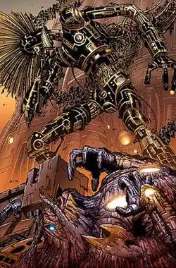 Warlock's transmode virus is less aggressive than that of other Technarchs, as shown when he calmed the violent instincts of a Technarch child by infecting him with his virus.[30] As a techno-organic being, Warlock can interface with and influence technology, including other robots like Ultron and Danger.[32][44] His physiology also makes him difficult to permanently kill, as he has been completely drained of lifeglow,[31] fatally wounded,[59] and reduced to ash,[18][47] but has returned to life through various means, including by being supplied with lifeglow[31] and possessing a host.[48][52]