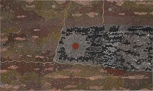 Contemporary Indigenous Australian art originated with the Indigenous men of Papunya, located around 240 kilometres (150 mi) northwest of Alice Springs in Australia's Western Desert, who began painting in 1971.[4] The youngest was Clifford Possum Tjapaltjarri, encouraged by his older brother Tim Leura Tjapaltjarri.[5] A number of the men developed a distinctive style of narrative painting that, beginning around 1976, resulted in the production of several "monumental" works that included representations of both their traditional lands and of ceremonial iconography.[6][7] Clifford Possum was the first to make this transition commencing with a related painting, also titled Warlugulong (1976), now held by the Art Gallery of New South Wales.[8] The two images are amongst five that the artist created between 1976 and 1979 that linked the iconography of sacred stories to geographic representation of his country – the land to which he belonged and about which he had traditional knowledge.[9][10] The artist's images of this period are visually complex, and contain a wide variety of patterns, unified by strong background motifs and structure.[11]