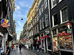 Warmoesstraat ('Chard Street') is one of the oldest streets in Amsterdam, running parallel to Damrak from Nieuwebrugsteeg to Dam Square. Its origins are in the 13th century. In the 16th and 17th century it was the shopping street. During the Dutch Golden Age, the father of legendary poet and playwright Joost van den Vondel ran a business as a silk merchant there.[1]