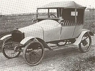 The car had a lightweight two-seat open body with full weather equipment. The car was launched in 1912 fitted with a JAP, V twin air-cooled engine of 964 cc with an RAC horsepower rating of 8 hp.[2] but by the 1913 Olympia show the company had swapped to using F. E. Baker Ltd Precision 50 degree V-twin engines of 964cc.[3] One model had the air cooled version of the engine, and the other used the water-cooled version.