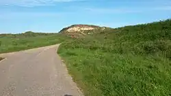 Ploughing of Warren Hill in 1913 revealed thousands of flint implements covering the entire Stone Age period.[9] Of particular archaeological interest were several blades rarely seen in the UK outside of caves; such blades are typically found at Upper Paleolithic sites across Europe, but open-air UK sites of such age are extremely rare.[6] Further excavations identified over 600 tools, dominated by backed blades, endscrapers and burins.[1] There are several barrow mounds on the hill that have been investigated previously, as well as traces of small defensive trenches from the Second World War.[4][10] Much of the Head has been lost over the years due to the effects of sea, weather, and the removal of many "doggers" (ironstone boulders),[11] causing the loss of several bloomery hearths and a Mesolithic campsite.[10]