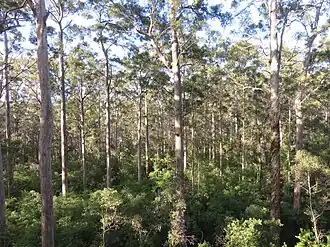 The park is dominated by old growth karri trees, some of which are almost 75 m (246 ft) in height.[2] Some of these trees were used to act as fire lookout towers built during the 1930s and 1940s. The 65 m (213 ft) Dave Evans Bicentennial Tree is situated within the park and was pegged in 1988 as part of Australia's bicentennial celebrations. This is one of three trees found around Pemberton that tourists are able to climb.[3]