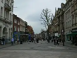 Warrington has been a major crossing point on the River Mersey since ancient times and there was a Romansettlement at Wilderspool.[10] Local archaeological evidence indicates that there were also Bronze Age settlements. In medieval times Warrington's importance was as a market town and bridging point of the River Mersey. The first reference to a bridge at Warrington is found in 1285.[11] The origin of the modern town was located in the area around St Elphin's Church, now included in the Church StreetConservation Area,[12] established whilst the main river crossing was via a ford approximately 1 km upriver of Warrington Bridge.[13] Warrington was the first paved town in Lancashire, which took place in 1321.[14]