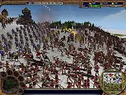 Warrior Kings: Battle is a real-time strategy game meaning much of its gameplay is focused on gathering resources and training and management of units for combat against opposing players.[1] There are three types of resources to harvest; food, materials and gold but are not available until they are dropped off at a village and then transported via cart to the main base or warehouse.[2] The later two are gathered from the surrounding environments like forests and mines while food is grown and harvested from built farms with speed of growth depending on how fertile the land beneath it is.[2] A proportion of the food delivered by farmers is removed when they deliver to a village or drop off point representing your fighting units' consumption of food. The proportion removed is reliant on how many farms you have working compared to number of food consuming units.[2] While villages and other resource-based buildings can be built anywhere other than within the base's walls, most military and economy based structures can only be built there, with each added building expanding the walls.[3] There is also a mana bar present on some special units (this is notably absent from all renaissance units) with the ability to use magic. Additionally, some special structures such as the empire cathedral and pagan temple have mana bars that can be refilled through prayer or sacrifice of units depending on the alignment.[4]