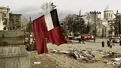![]() ![]() ![]() ![]() Clockwise from top: A Chechen child soldier stands in front of a burning house; a mourning ceremony for victims of the Khojaly massacre at Agdam Mosque; Dutch Organization for Security and Co-operation in Europe monitors inspecting a Georgian military installation near the South Ossetian line of contact; Zviadist soldiers hiding from gunfire behind the Georgian Parliament Building; destruction in the Abkhaz capital of Sukhumi following the War in Abkhazia, 2006 | |||||||