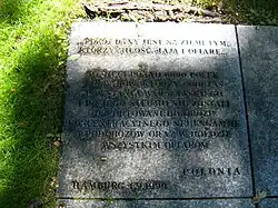 It was unveiled on 1 September 1999 among others by Hamburg culture senator Christina Weiss and in the presence of novelist Andrzej Szczypiorski.[1][2] On a polished surface made up of 36 elements, two of which with German and Polish texts on opposite sides, and to be walked on, are positioned in three rows 30 rough-hewn granite blocks. A gravel path is leading to the front side of the sculpture with which it forms a small valley.[3] The stone used is exclusively Polish Strzegom granite. The memorial is dedicated to the 6000 Poles deported from the 1944 Warsaw Uprising to the Nazi concentration camp in Neuengamme and was initiated by the Polish community in Hamburg commemorating at the same time the 60th anniversary of the outbreak of World War II. Polish sculptor Jan de Weryha-Wysoczański created the monument pro bono.[4][2][5][6]