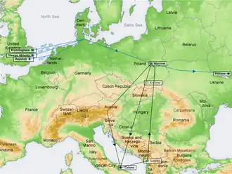 Warsaw lay 1,311 km (814.6 mi) north east from the Allied bases in Apulia and Brindisi in Italy. The route from Italy was planned to take the aircraft north east from their home airfields over the Adriatic and Croatia at sunset to reach the Danube in Hungary in darkness. They would then climb north east over the Carpathians and into Soviet held territory, to approach Warsaw from the south east. The return leg was routed over eastern Germany and eastern Austria with the aircraft arriving back at their point of origin by mid morning the following day.[8] These aircraft flew without fighter escort and had to rely on their on-board armament to ward off German night fighters, who were able to vector in on their flight-paths with information from German ground-based controllers. A Luftwaffe night-fighter training school at Kraków presented a continual problem as did ground-based AAA along the route.[8] Aircraft also reported having been attacked by Russian fighters as well as Russian AAA close to Warsaw.[9] Major General Jimmy Durrant of No. 205 Group RAF was in command of operations from Italy and assigned No. 334 Special Operations Wing RAF (No. 148 and No. 624 Squadron RAF, each equipped with 14 Halifaxes and 1586 Polish Special Duty Flight equipped ten aircraft being a mixture of Halifaxes and B-24 Liberators) to supply Warsaw. No. 178 Squadron RAF was later also assigned to support the airlift.[10][Note 4] 2 Wing SAAF contributed 31 and 34 Squadrons for operations, both equipped with Liberators.[12]