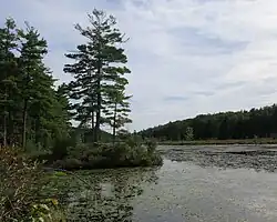 According to the United States Census Bureau, the town has a total area of 37.6 square miles (97.5 km2), of which 37.3 square miles (96.7 km2) is land and 0.31 square miles (0.8 km2), or 0.83%, is water.[5] The geography of Warwick is dominated by Mount Grace. This mountain is located in the center of town and has a network of hiking and cross-country ski trails. Most of the mountain is owned by the state (as part of Mount Grace State Forest) and open to the public. The Metacomet-Monadnock Trail passes over the 1617 foot (493m) summit. Approximately a third of the town's land is protected as part of the Warwick State Forest thereby offering a variety of outdoor activities for the public. There are several ponds, some created by dammed brooks in Warwick, including Moores Pond, Sheomet Lake, Laurel Lake, Wheeler Reservoir, Richards Reservoir, Hastings Pond and Stevens Swamp, a mosaic of wetlands. A small wildlife management area is also located within town. The Mount Grace Land Conservation Trust, which was founded by Warwick resident Keith Ross in 1986, pays homage to the mountain by dint of its name, though its land protection activities take place in 23 municipalities.[6]