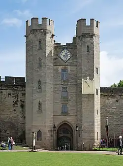 Under Thomas de Beauchamp, 11th Earl,[5][21] the castle defences were significantly enhanced in 1330–60 on the north eastern side by the addition of a gatehouse, a barbican (a form of fortified gateway), and a tower on either side of the reconstructed wall, named Caesar's Tower and Guy's Tower.[21][22] The Watergate Tower also dates from this period.[23]