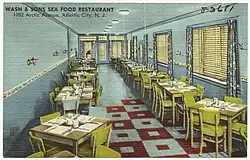 By the 1950s the business had outgrown its space. The Washingtons rented a larger location with an industrial kitchen a few blocks away at 1702 Arctic Avenue.[9] The restaurant was renamed Wash & Sons' Seafood Restaurant and sported large picture windows; the interior had a seashell motif, flower boxes, and placemats with beach scenes.[1][10] Industrial ceiling fans cooled off the dining area.[11] By the summer of 1953 the new restaurant had been completely renovated and could seat more than 100 customers.[12] Soul food specialties included seafood, barbecued ribs, fried chicken, and sweet potato pie,[13] as well as a full breakfast menu including bacon, sausage, eggs, pancakes, grits, and home fries.[14]