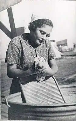 Many parts of the world still use washboards for washing clothes.[3] Clothes are soaked in hot soapy water in a washtub or sink, then squeezed and rubbed against the ridged surface of the washboard to force the cleansing fluid through the cloth to carry away dirt. Washboards may also be used for washing in a river, with or without soap. Then the clothes are rinsed. The rubbing has a similar effect to beating the clothes and household linen on rocks, an ancient method, but is less abrasive. Military personnel often use washboards to do their laundry when no local laundry facilities exist.[4]