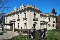 The Gale Mansion, at 2115 Stevens Avenue South, was built in 1912 to designs in the Renaissance Revival style by Ernest Kennedy of Minneapolis. In 1855, the 40-acre (16 ha) tract had been purchased for $50. Water company records indicate that several smaller houses once occupied the Stevens Avenue site.[4] The owner, Edward Chenery Gale, was the son of Minneapolis pioneer real estate broker Samuel Gale. His wife, Sara Belle Pillsbury, was a daughter of Governor John S. Pillsbury. The house, now owned by the American Association of University Women, is faced in Bedford limestone. Many modern features were part of the design: a central vacuum-cleaning unit, a kitchen at ground floor level, rather than secreted in the basement, an intercom system. The house was centrally heated with a coal furnace; the decorative fireplaces were infrequently used.[2] In the garden stands a fountain with the sculpture Boy with a Duck by Frederick MacMonnies.