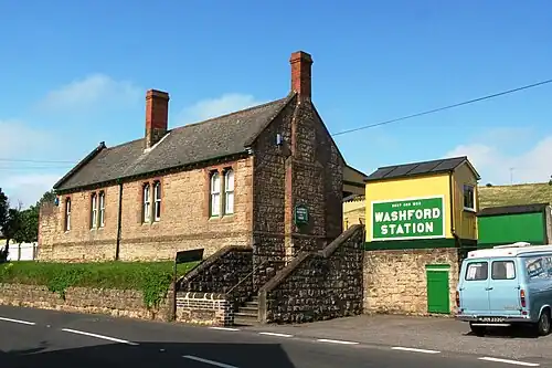 Washford is the second highest station on the line and is situated in a gap between the coastal cliffs and the Brendon Hills. It is accessed by two very steep inclines for steam trains – climbing up from Blue Anchor trains face a 1 mile (1.6 km) section at 1 in 65 (1.5%), the steepest on the line. The station has a single platform on the south side of the line, although there is an extensive yard on the opposite side of the line from the platform, where the Somerset and Dorset Railway Trust was based (see below) and is now a carriage works operated by the West Somerset Railway Heritage Trust.[3]