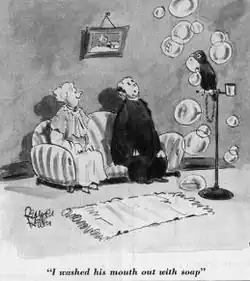 In 1953, Wisconsin judge Harvey L. Neelan fined a Miss Mertz $25 for her drunken obscenities and noted that she should be required to wash her mouth with soap.[16] In 1963, Michigan judge Francis Castellucci ordered Louis Winiarski, who had been found using obscene language around women and children, to wash his mouth with soap before leaving the courtroom.[17] A similar case in October 1979 saw a New York resident choose to wash his mouth out with soap, rather than serve ten days in prison for his disorderly conduct and obscenities.[18]