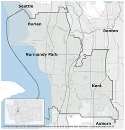 It is in King County and consists of east Burien, Normandy Park, SeaTac, Des Moines and parts of Kent, Tukwila, and Renton.