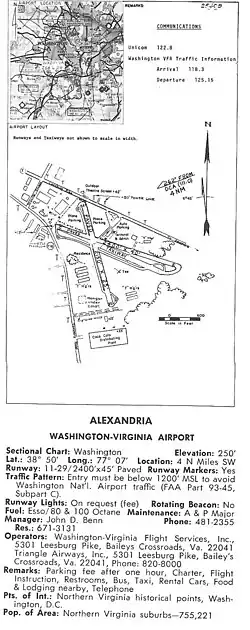 As the 1960s progressed, increased urbanization led to the closure of other general aviation airports in the Washington D.C area to include Beacon Field Airport in nearby Alexandria, Virginia. The closure of that facility resulted in many of its aircraft relocating to the Washington-Virginia Airport. By the mid-1960s over 100 aircraft were housed in Washington-Virginia's hangars or on the fields adjacent to the runways.[1] A 1968 Aircraft Owners and Pilots Association airport directory said that the airport offered fuel, repairs, hangar, flight instruction, and charter services and that bus, taxi, rental cars, food and lodging were also available. The airport's manager was listed as Charles D. Benn. The directory also stated that the airport had only one runway in use (12/30) as the north–south runway (17/35) had been closed at the request of the state for safety reasons.[1][12]