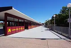 At least one designer had much grander plans. Winston Close, an adviser from the university to the architectural team, envisioned modeling the top level on the Ponte Vecchio bridge in Florence, Italy. This would have included shops, making the bridge a place to stay rather than just get across.[5] Some effort has been put into making the site a more inviting place. The addition of the upper deck enclosure led to an annual artistic event held on the first few days of classes, where organizations of all stripes can put their brushes to panels lining the interior. While most are self-promotional messages from campus groups, some of the panels always show impressive designs.