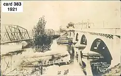 The first bridge at this point was proposed in 1803 by the Milford and Stratford Bridge Company, which changed its name to the Washington Bridge Company that same year. The first permanent standing (wooden) bridge opened in 1813, complete with a toll.[7] This bridge was rebuilt at least twice: once in 1807 when ice flows carried the bridge out to sea and again in 1868 when it was struck by the steamer Monitor.[8]