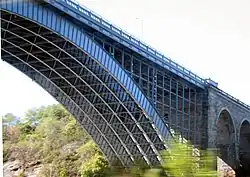 The arches were constructed on falsework.[28][72] Construction on the frames of the masonry arches was commenced in September 1887 and they were all enclosed by early 1888.[18][35] The eastern metal arch across the railroad tracks was fabricated from September to December 1887,[79] and installed in January 1888.[80] This was followed two months later by the installation of the western arch above the river.[81][82] On average, two hundred men were involved in the installation of the main arches between September 1887 and May 1888.[72][82] Both the main arches and the approaches required extensive scaffolding.[72] The rubble-masonry interior walls of the approach viaducts were installed between April and July 1888.[41] By the beginning of that July, the deck was nearly completed.[83] The roadway and sidewalks were laid from August to November of the same year.[18][84] Overall, the bridge cost $2.85 million to construct, equivalent to $99,739,000 in 2024.[6][85]