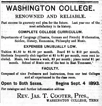 By the 1880s, Washington College was again prospering under the presidency of J.W.C. Willoughby, reporting an enrollment of 148 in 1884. It began awarding Bachelor of Science, Bachelor of Arts, and Bachelor of Instruction degrees during this period. The YMCA and YWCA established organizations on campus, and a school newspaper, the Progressive Educator (later known as the Pioneer Educator) was launched in 1886. The 32-year presidency of James T. Cooter, which began in 1891, saw the school transition to a junior college. An industrial department was established, and a 135-acre (55 ha) farm was purchased in 1900. The school was one of the first in the area to obtain a telephone connection and electricity.[3]