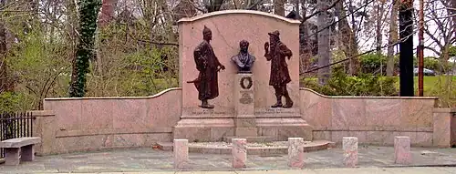 It consists of three parts: a tall central panel 10 feet (3.0 m) high and eight feet (2.4 m) wide, bronze sculptures of two of Irving's characters, Rip Van Winkle and King Boabdil, flanking a bust of the author on a six-foot (1.8 m) pedestal. Curved wing walls four feet (1.2 m) high and twelve feet (3.7 m) long come out on either side, further extended by ten feet (3.0 m) of wrought iron fencing. All the stone is pink Vermont granite with dark veins. An inscription carved in the center memorializes Irving's multiple careers, and identifies the two characters depicted at his sides.[1]