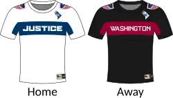 On November 29, 2018, the franchise name was revealed as the Washington Justice; the name "Justice" represents the teams core values. "Justice is a universal value and the perfect name for a franchise that we hope will inspire and unite both our Washington area community and fans around the globe", said owner Mark Ein. "There is no region in the world that attracts more people to serve the cause of justice in government, philanthropy, academia, military service, and the private sector than Washington. In fact, DC's official city motto is 'Justitia Omnibus,' which translates to 'Justice for All.' As a team representing the broader DMV region, it was important that our team identity reflects a value that unifies all of our community members, representing the full diversity of backgrounds and beliefs."[6] The team's logo is a red, white, and blue striped shield, representing the American flag, with the Washington Monument centered in a subtle W at the bottom.[6]
