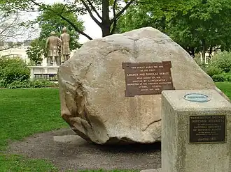 On August 21, 1858, the first of the Lincoln-Douglas debates was held in Ottawa's Washington Park. The site of the debate is marked by a large boulder affixed with a plaque.[6] The boulder was erected on August 21, 1908, by the Daughters of the American Revolution.[6][13] The day of the debates 10,000 people flocked to Washington Square.[3] Salesmen sold their wares to the mingling crowd and excited politicians were canvassing and quarreling throughout the park.[2]