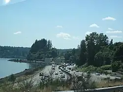 SR 3 becomes a four-lane divided freeway and travels northeast along the Sinclair Inlet to an interchange with SR 304 in Navy Yard City, serving the city of Bremerton and Naval Station Bremerton.[8] The freeway continues through western Bremerton past the diamond interchange with SR 310 and the community of Chico along Dyes Inlet.[9] SR 3 travels west of Silverdale past the western terminus of SR 303 at the Kitsap Mall and east of Naval Submarine Base Bangor in Bangor.[10] The freeway continues north towards Poulsbo past the termini of SR 308 and SR 305, which serve Keyport and Bainbridge Island respectively.[11][12] SR 3 travels north from Poulsbo as a two-lane road towards Port Gamble and ends at the eastern approach of the Hood Canal Bridge at an intersection with SR 104.[1][6]