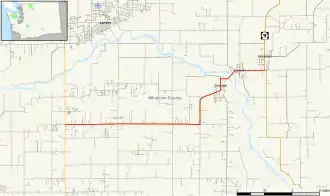 SR 544 begins at a roundabout with SR 539 (the Guide Meridian) on the south side of Wiser Lake near Lynden. The highway travels east on Pole Road through farmland and passes a housing subdivision near the Raspberry Ridge Golf Course.[2] SR 544 continues due east along Fourmile Creek and turns north at a junction with Everson Goshen Road near several gravel pits and the Nooksack Indian Reservation. After passing several industrial businesses, the highway turns northeast to enter Everson and turns north onto Mead Avenue near the city's elementary school. SR 544 then turns east once again at Kale Street and continues northeast onto Everson Road as it crosses the Nooksack River alongside a section of the Bay to Baker Trail.[3] The highway travels east through downtown Everson on Main Street, passing several businesses, the city hall, and a branch of the Whatcom County Library System.[4] SR 544 continues across a small patch of farmland to neighboring Nooksack, where it becomes Columbia Street and runs for several blocks on the southern outskirts of the town.[5] SR 544 terminates at a junction with SR 9, which uses a block Columbia Street to cross over the BNSF Railway's Sumas Subdivision before continuing north towards Sumas and south towards Sedro-Woolley.[6][7]