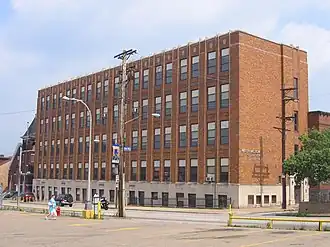 In 1930, the school was expanded to take in the students from the Arsenal Trade School, which was being razed to clear the site for Arsenal Junior High School.[8] A one-story shop building was constructed behind the school to accommodate the additional students. In 1937, a much larger addition was built onto the front of the original school with the help of federal Public Works Administration funding. The new building was a four-story, Art-Deco-style structure designed by Marion M. Steen.[6] It had a capacity of 900 students and included facilities for printing, drafting, and bricklaying along with an auditorium.[9]