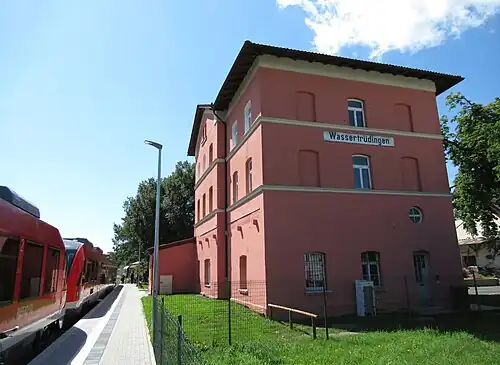 Wassertrüdingen station is a railway station in the municipality of Wassertrüdingen, located in the Ansbach district in Bavaria, Germany. The station lies on the Nördlingen–Pleinfeld railway. The train services are operated by DB Regio Bayern and for the museum traffic BayernBahn.