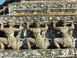 The central prang symbolises Mount Meru of the Hindu cosmology.[18] The satellite prang are devoted to the wind god, Phra Phai. The demons (yaksha) at the entranceway to the ubosot are from the Ramakien. The white figure is named Sahassa Deja and the green one is known as Thotsakan, the Demon Rāvana from Ramayana.