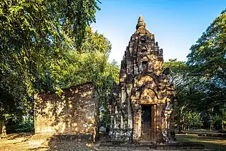 In the Sukhothai period, the site was converted into a Buddhist temple. The base of the prang was partially buried, covering the mouldings, and a laterite vihara was constructed in front of it, along with a laterite mondop to the north housing a standing Phra Attharot image. Inside the mondop is the laterite core of a standing Buddha image with hands close to the body.[2]