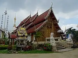 The Lanna style can be seen in the large assembly hall and the adjacent ordination hall on the eastern side of the temple. The assembly hall was constructed around 1865 and renovated in 1957. Inside are murals depicting the Vessantara Jātaka and scenes from the Buddha's enlightenment.[2] One of the bronze Buddha images made in Lanna dates from the late 15th to early 16th century.[4]