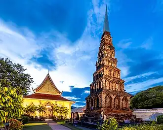 The unusual pyramid-shaped, 46 m high Chedi Suwanna in the northwest of the compound is in the Dvaravati-style of the Haripunchai period and believed to be modeled on similar stupas at nearby Wat Chama Thewi (Wat Kukut).[1][2][4] The chedi is featured on the reverse of the one-satang coin.