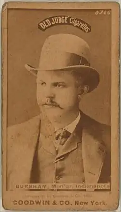 Burnham, who was described in the Chicago Tribune as the main promoter of the effort to get an Indianapolis club in the National League,[5] began the 1887 season as the manager of the upstart National League team, the Indianapolis Hoosiers. However, after a very slow start, the team had a 6–22 record and was in last place. He was fired on June 2. Fred Thomas took over as interim manager in addition to his front office duties.[7]