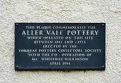 Work at the Aller Vale Pottery site ceased in about 1924, and the site is now occupied by a small estate of offices and light business units, surrounded by houses.[10]